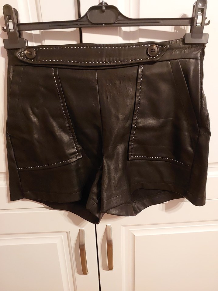 Kemerli, siyah deri mini şort, Paris tarzı gotik ve iddialı görünüm için uygun. İnce dikiş detaylarıyla romantik akşamlar için ideal.