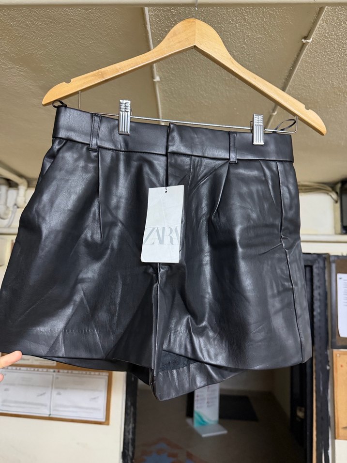 Siyah deri, kemerli ve bol kesim mini şort, sokak stili için uygun. Baskılı deseni ve kısa boyu ile dikkat çekiyor.
