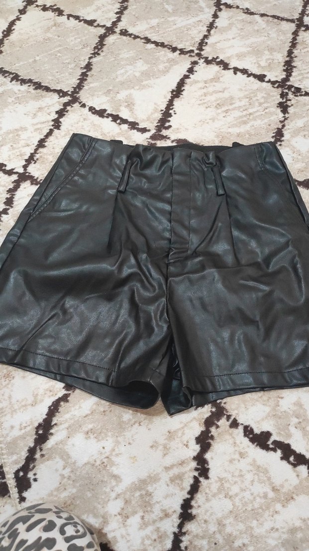 Siyah deri, kemerli, bol kesim mini şort. Günlük kullanım için goth tarzı sokak stili sunar.