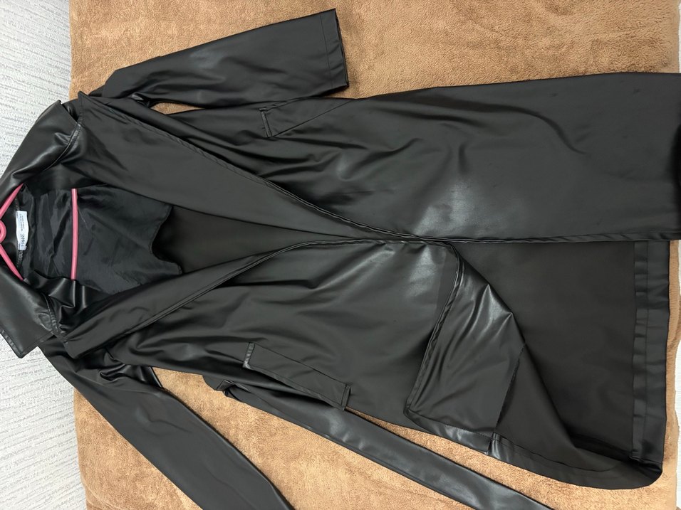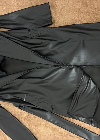 Siyah Deri Kemerli Uzun Kadın Ceket