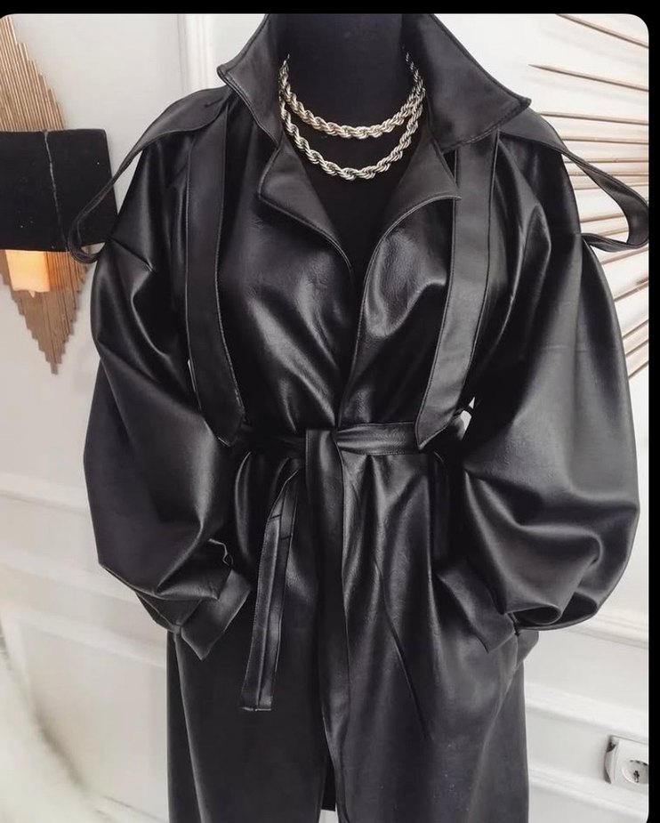 Siyah deri kemerli uzun kollu ceket, bol kesim ve yakalı tasarımıyla gotik tarzı yansıtır. Özel dikimdir 70 - 80 kilo arası uyumludur