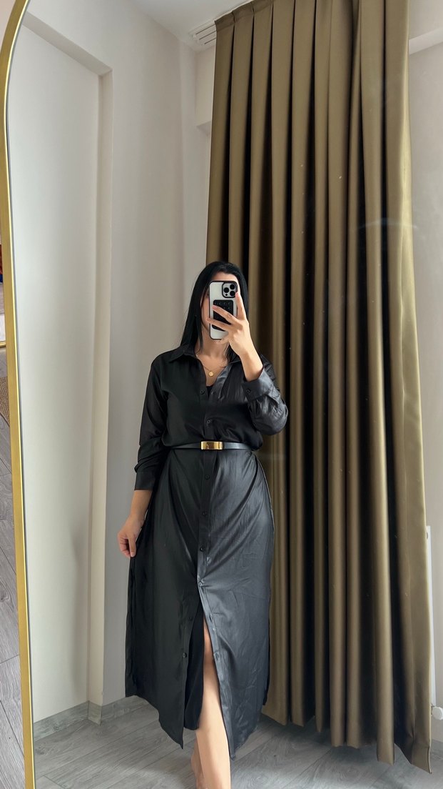 Siyah deri görünümlü , uzun kollu, yakalı içinde ince uzun askılı elbisesi de mevcut günlük ve şık zamanlarda kullanabilirsiniz . Yenidir. L / Xl bedene de olur.