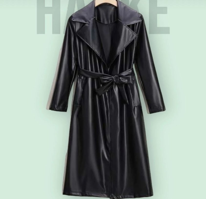 Siyah Deri Kemerli Uzun Kadın Trençkot