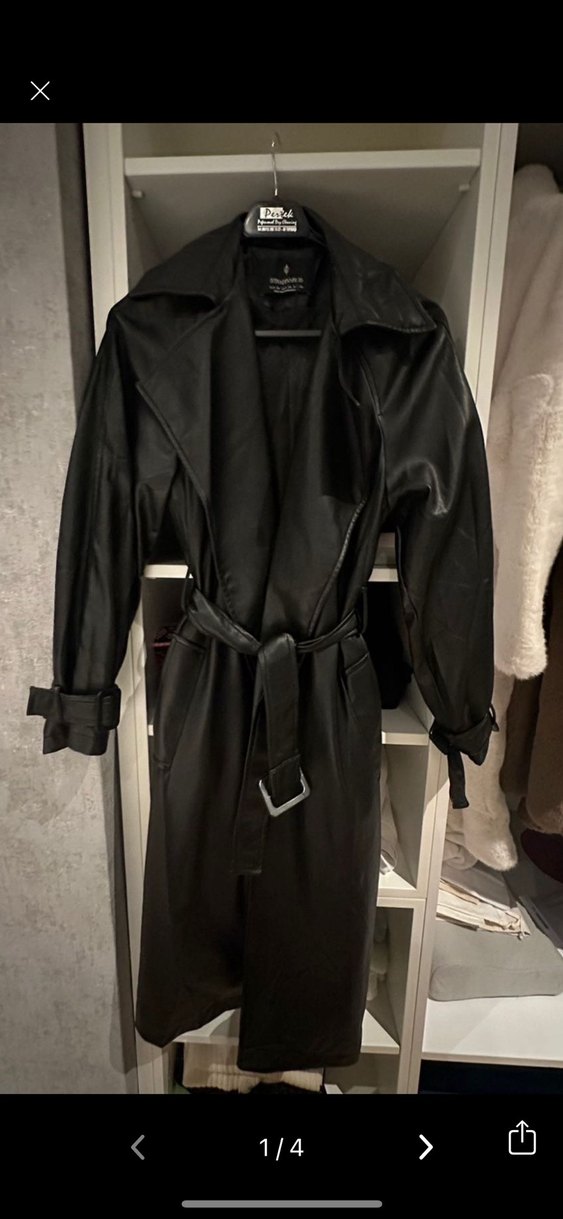 Siyah deri, kemerli uzun trençkot. Notlu yaka ve askılı kol detayıyla şık ve fit kesim. Kol kemerin biri yok