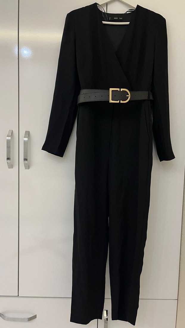 Siyah deri kumaştan, kemerli ve uzun kollu tulum. Notlu yaka ve regular fit kesimiyle iş ve sokak modasını bir araya getirir.