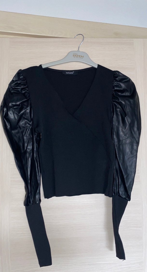 Siyah deri uzun kollu, kemerli ve V yakalı, kısa kesim, dar kesim bluz. Trendy casual goth tarzı için ideal.