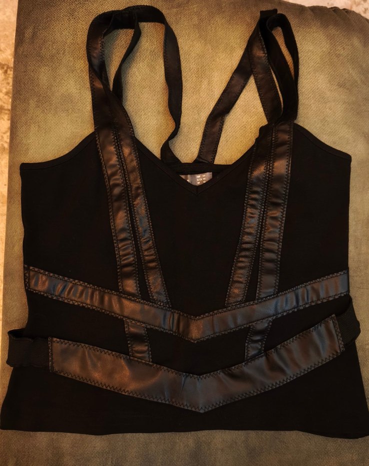 Siyah deri kemerli, V yaka ve askılı fitted bustier. Goth tarzı, midi boy ve desensiz, günlük kullanıma uygun.