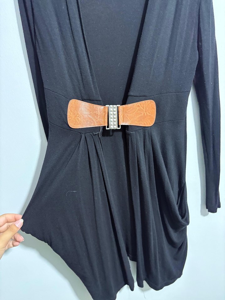 Siyah, deri kemerli ve V yakalı bu uzun elbise, minimalist gotik tarzıyla günlük kullanıma uygundur. Dar kesim ve askılı kollara sahiptir.