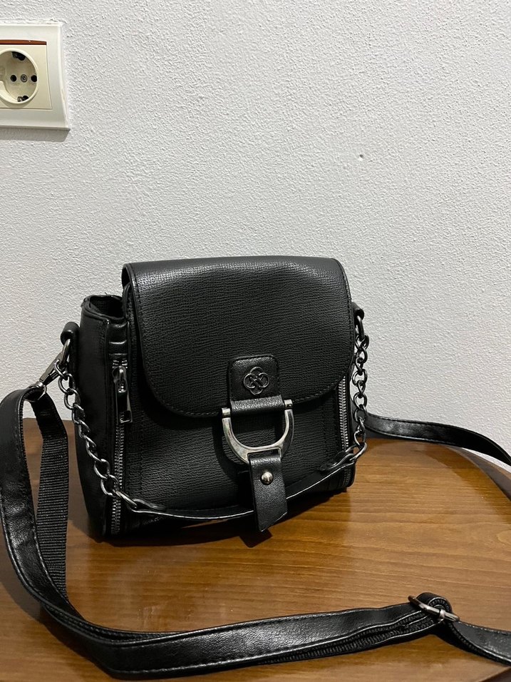 Kemer detaylı kapak ve yılan deseni dokusuna sahip siyah deri çanta, zincir aksesuar içerir. Günlük kullanıma uygun gotik tarzda.
