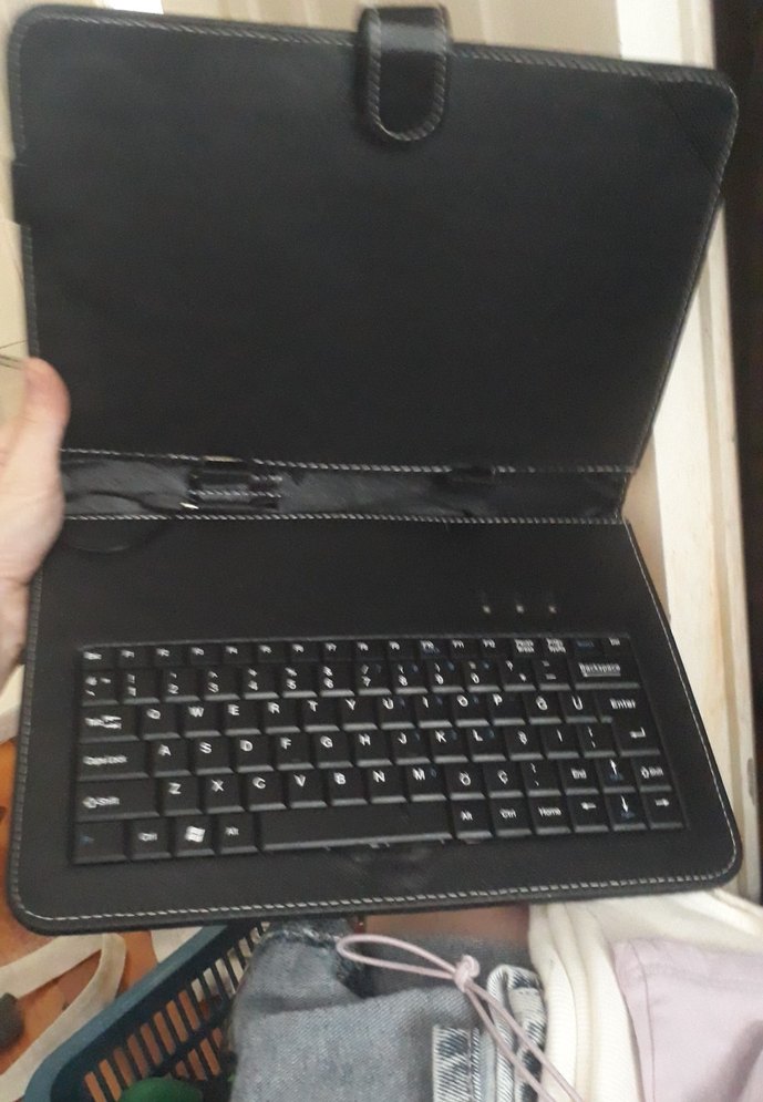 Kilitli deri kılıf içinde yer alan siyah klavye, standart tuş düzenine sahip kompakt bir yazma çözümü sunar. Taşıma ve koruma sağlar. ⌨️