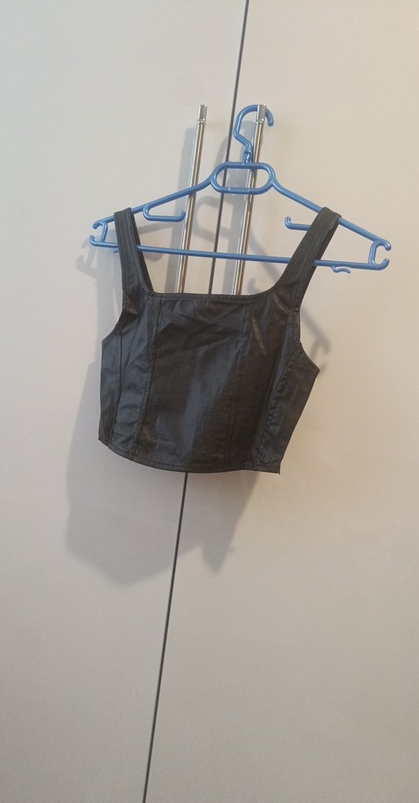 Siyah deri, kısa boylu, askısız ve kolsuz, vücuda oturan bustiyer. Gotik tarzda şık ve dikkat çekici.