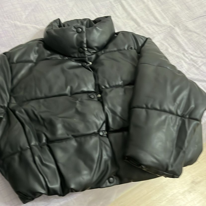 Düğmeli, yüksek yakalı, siyah deri, kısa kesim kadın mont. İnce kesimi ve kayış detaylı kollarıyla rahat ve şık bir sokak tarzı sunar.