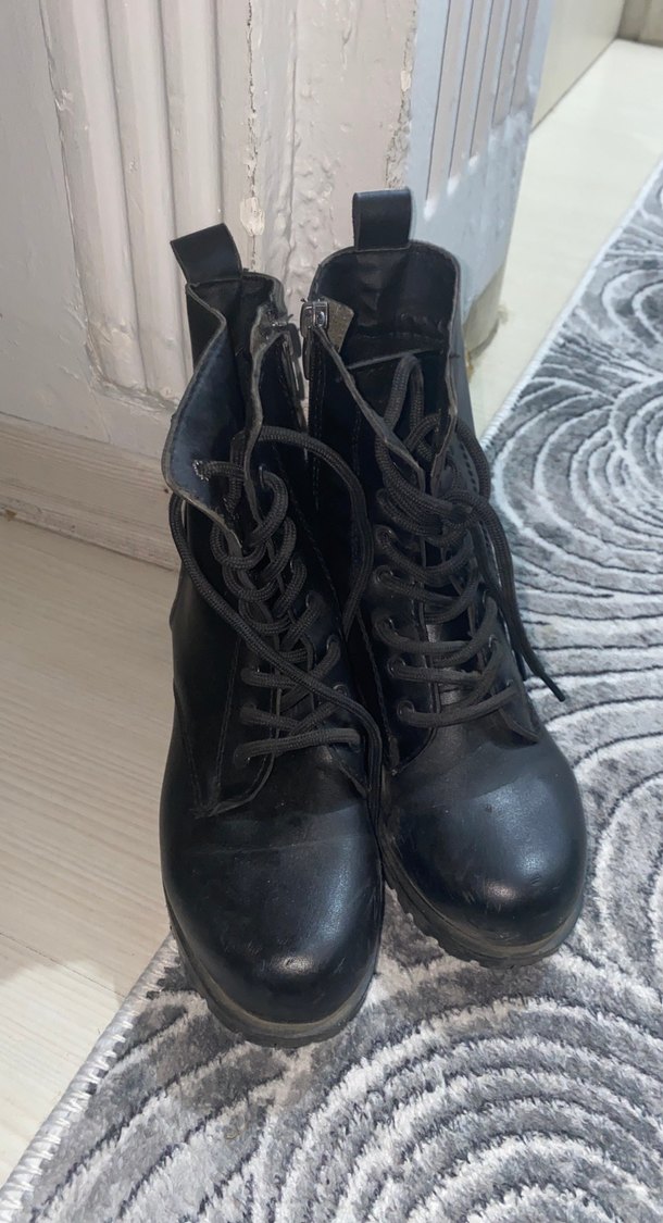 Siyah deri kadın botları,kısa topuklu ve bağcıklı, tokalı detaylarla grunge punk tarzını yansıtıyor. Günlük kullanıma uygun rock punk havası taşıyor.