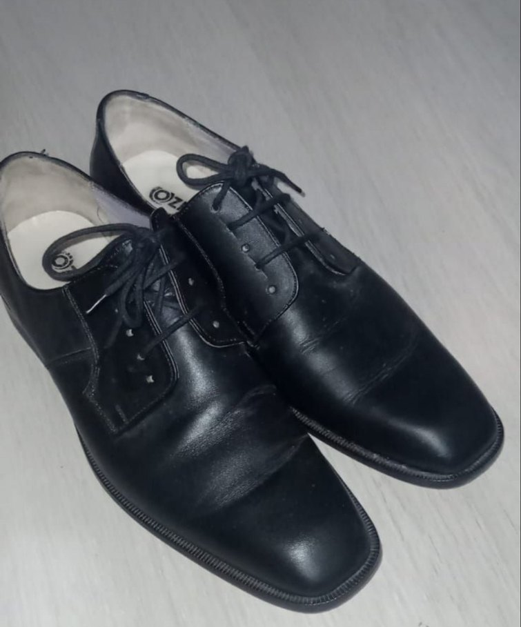 Siyah deri, desensiz yüzeye sahip klasik erkek ayakkabıları. Ofis için uygun, rahat şıklık sunan, klasik zarafetle gotik stilini birleştirir.