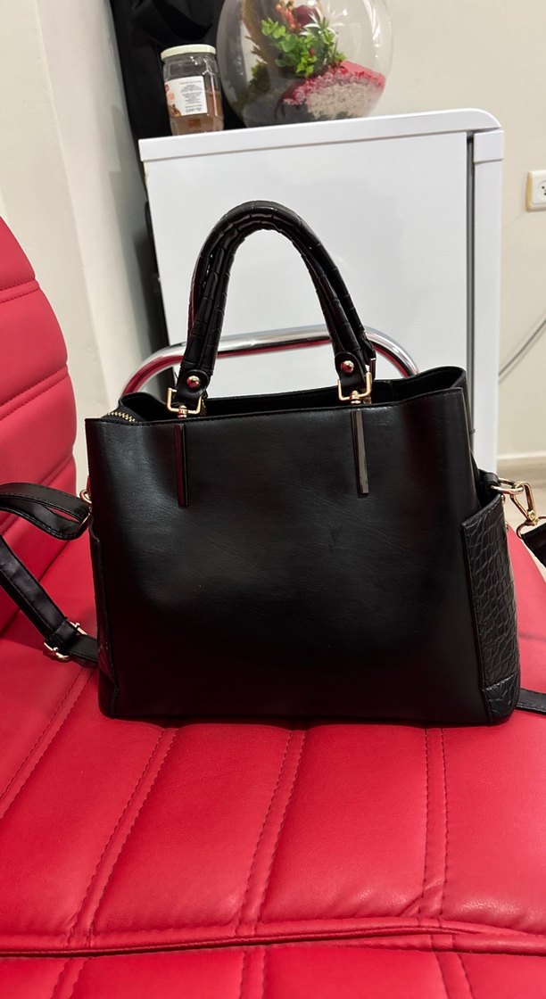 Kemer tokalı sapları ve desensiz şık tasarımıyla siyah deri kadın çantası, iş için günlük kullanıma uygundur.