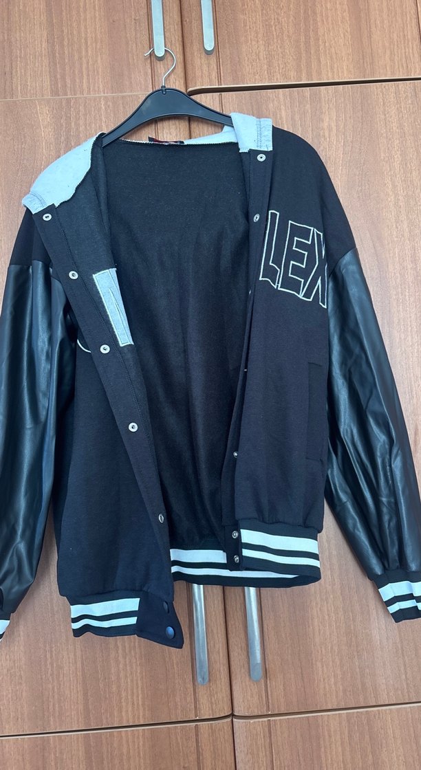 Siyah deri kollu, düğmeli içi yünlü kolej ceket hiç kullanılmamış