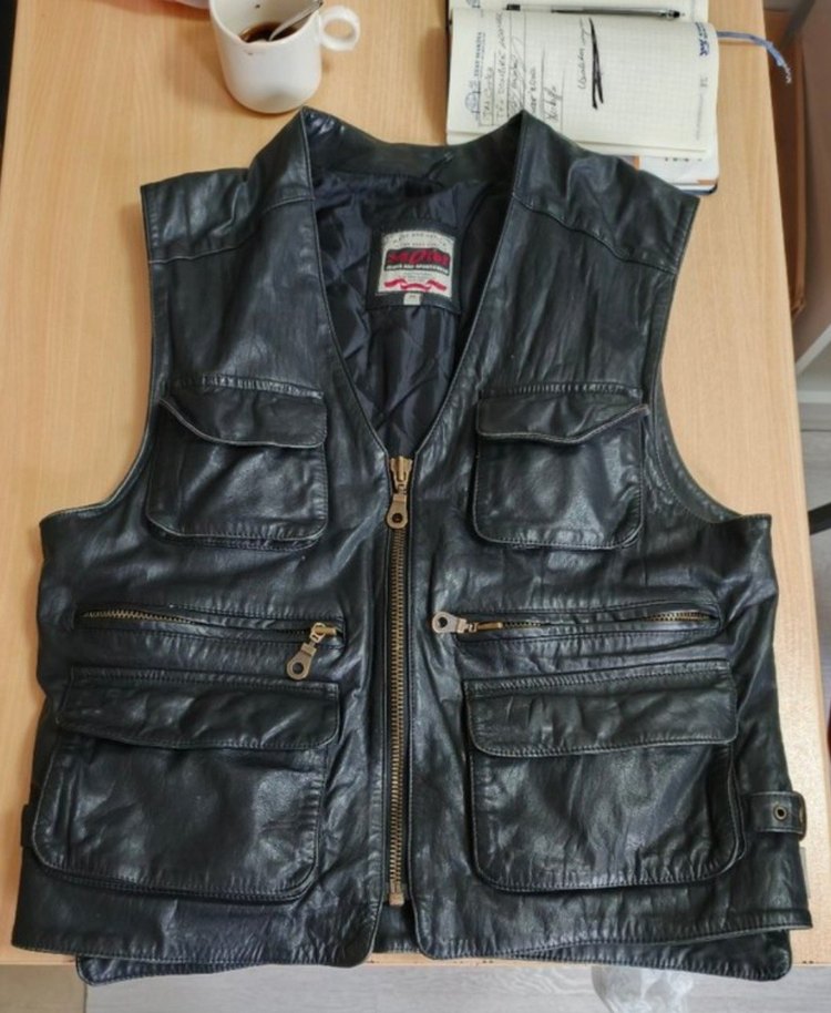 Siyah deri, kolsuz biker yelek, kesik yaka ve çok sayıda fermuarlı cep içerir. Günlük kullanıma uygun, vücuda oturan rahat bir tarza sahiptir.