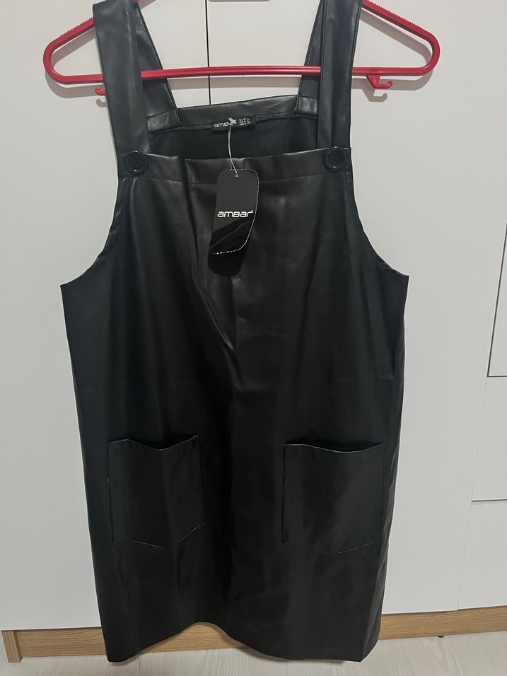 Siyah deri kolsuz midi salopet, bel detaylı ve straplez yakalı, ön cepli, fit kesimle günlük kullanıma uygun.