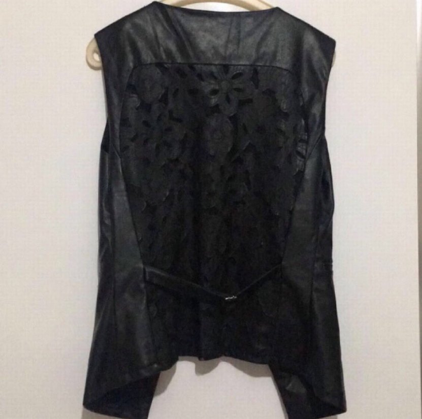 Siyah deri, kolsuz, V yakalı, kemerli ve desenli sırt detaylı yelek. Ofis için uygun, midi boy ve vücuda oturan kesimde.
