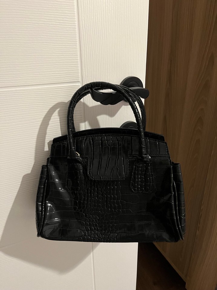 Siyah deri, krokodil desenli ve tokalı kadın çantası. Minimalist.