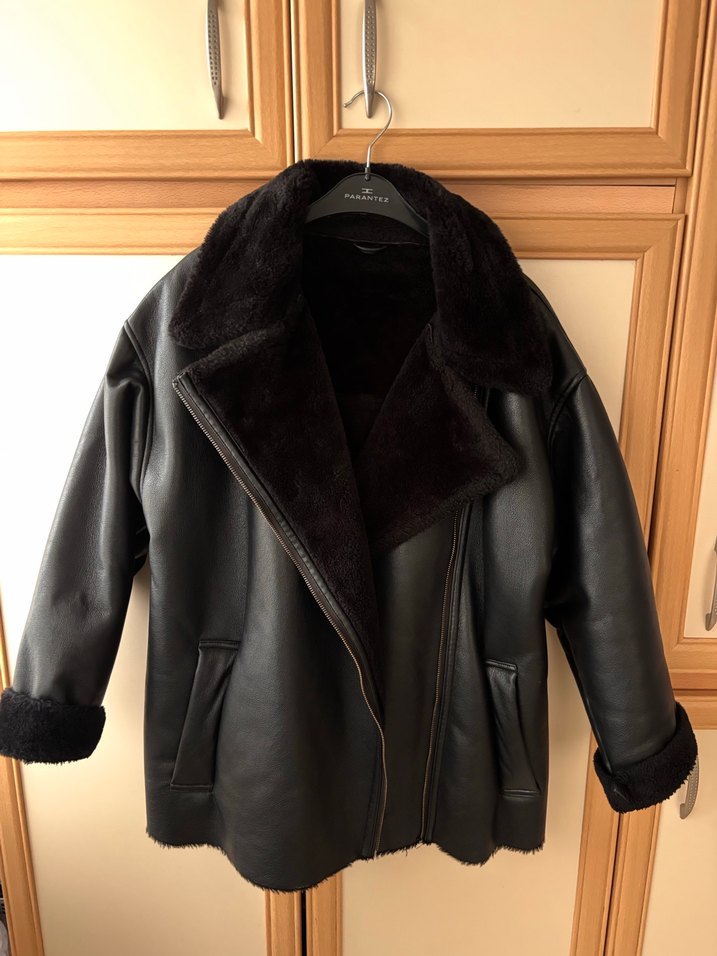 Siyah deri biker ceket, yumuşak kürk detaylı yakası ve manşetleri, kesik yaka ve bol kesimiyle rahat ve şık bir görünüm sunar.