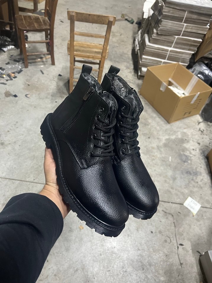 Siyah deri ve kürk detaylı erkek botları, sokak stiline uygun gündelik rahat kullanım için tasarlandı.