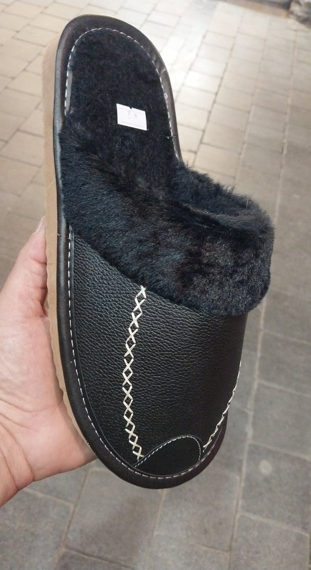 Siyah deri, kürklü detaylı ve erkek terlik, günlük rahat kullanım için uygundur.