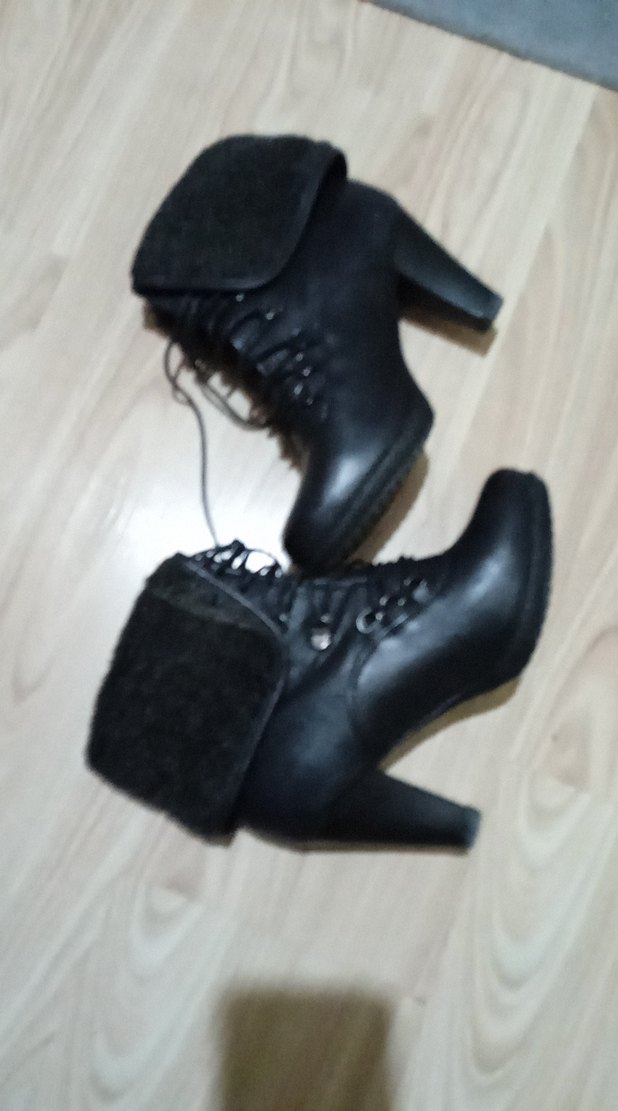 Kürklü detaylara sahip siyah deri, blok topuklu gotik bot. Günlük kullanıma uygun, desen içermeyen şık tasarım.
