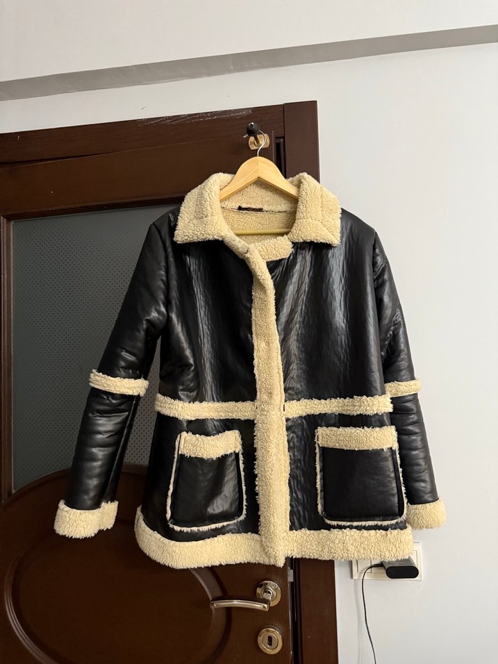 Siyah deri ceket, kürk detaylı yakası, manşetleri, cepleri ve etek ucu ile şık ve rahat. Normal boy, keskin yaka ve askılı kollu, günlük kullanım için uygun.