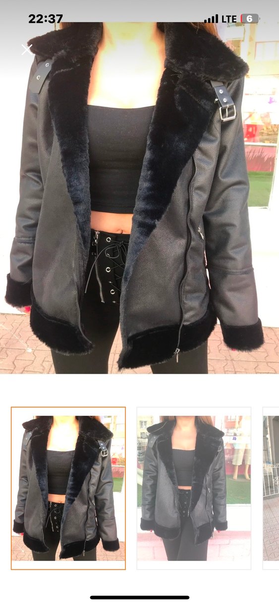 Siyah deri ceket, yaka, manşet ve etek ucunda kürk detaylıdır. Notlu yaka ve askılı kollara sahip, goth tarzında, günlük kullanıma uygun midi uzunluktadır.