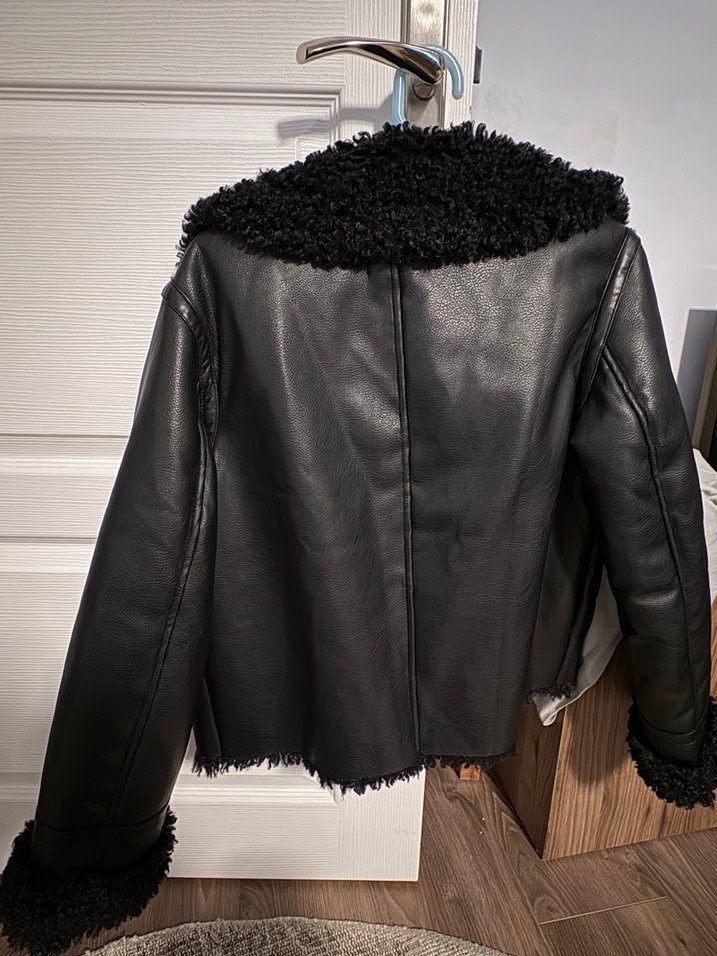 Siyah deri, kürklü yaka ve manşet detaylı, normal boy, fitted kadın ceketi. Rahat ve şık, günlük kullanım için uygundur.