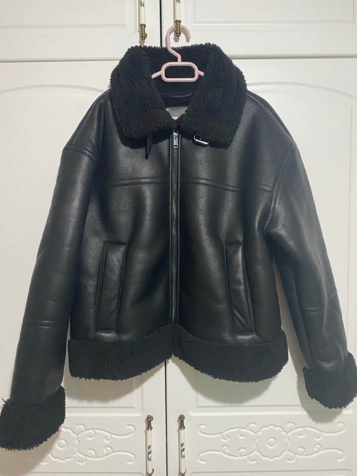 Siyah deri ceket, yakada, manşetlerde ve etekte kürk detaylıdır. Fitted kesim, yakalı ve fermuarlı, günlük kullanım için uygundur.