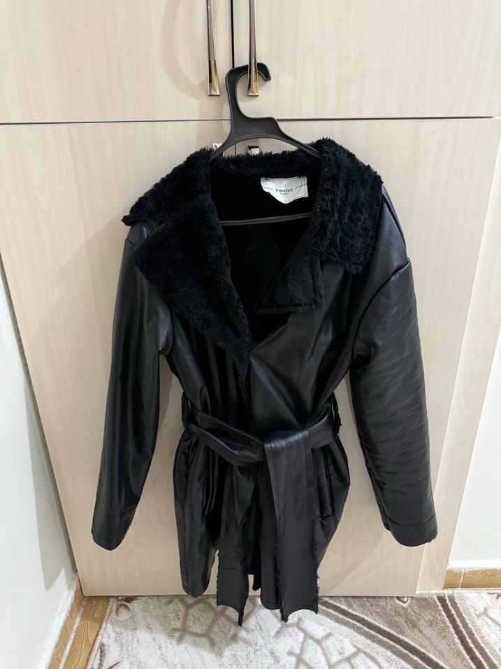 Siyah deri, kürklü yakalı, kemerli ve strappy kollu, midi uzunlukta kadın ceket. Günlük kullanıma uygun, şık ve sade tasarım. Temiz kusuru yok 38 bedene uyumlu