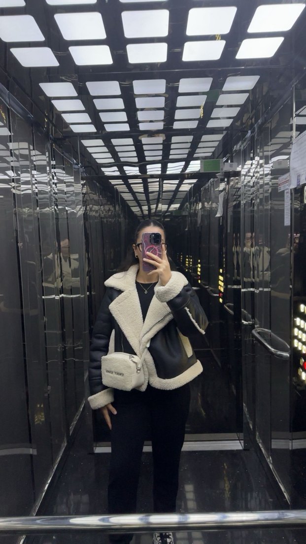 Siyah deri, kürklü detaylı, normal boy, fitted kesim kadın kış ceketi. Notch yaka ve uzun kolludur, günlük kullanıma uygundur. Bir kac kere kullndim kalibi bi tik kucuk