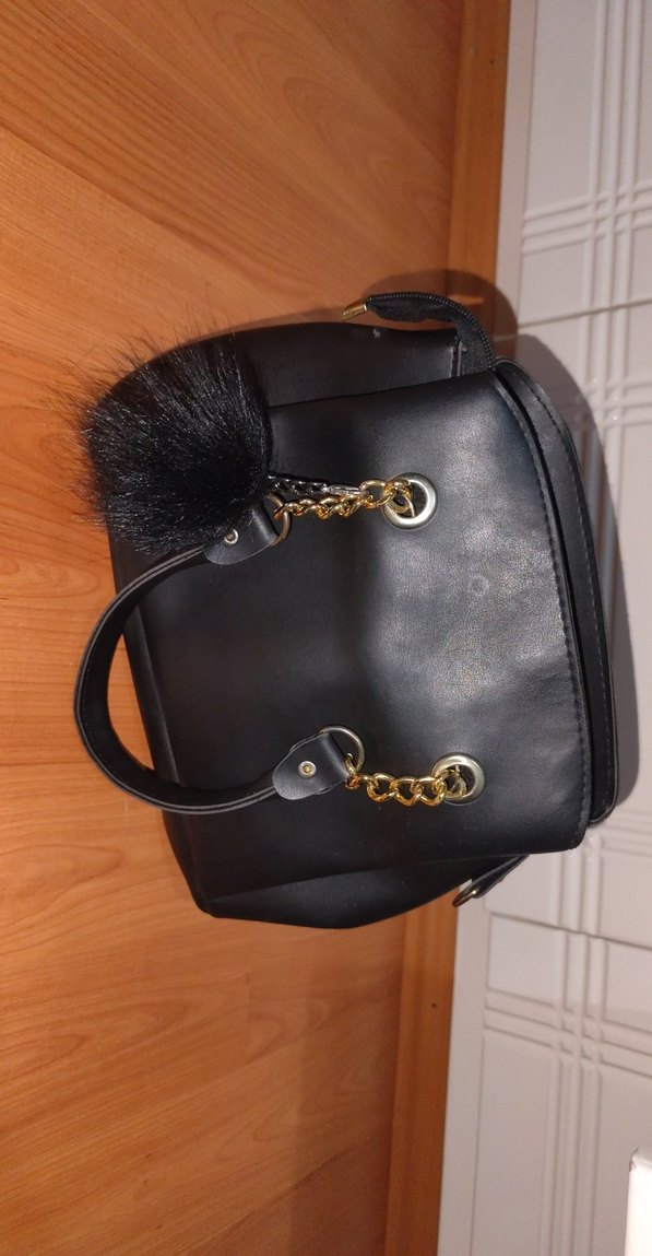 Siyah deri, kürk detaylı ve altın zincir saplı kadın omuz çantası. Parlak yüzeyi ile goth ve Paris tarzına uygun şık bir model.