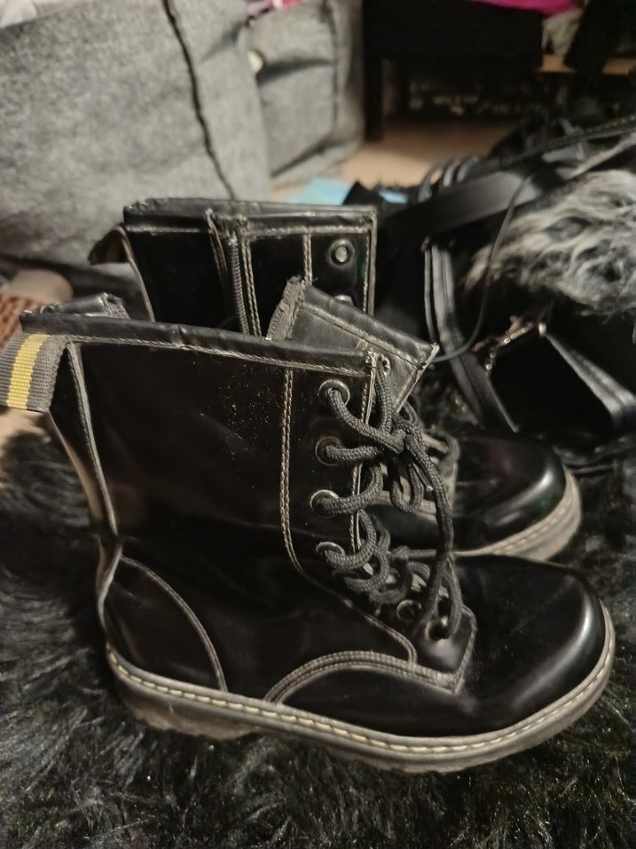 Siyah deri botlar, kürk detaylı ve platform topuklu, desenli tasarıma sahip. Günlük kullanım için uygun goth punk tarzında. görüldüğü gibi