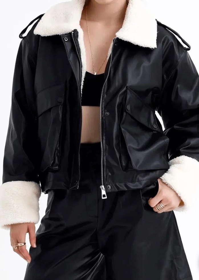 Siyah deri ceket, rahat kesim, yakada ve manşetlerde kürk detaylı, notched lapel yakalı, dış mekan için uygun.