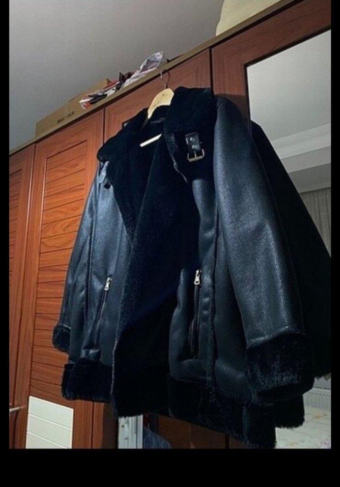 Siyah deri, kürklü detaylı, normal boy midi ceket. Notch yakalı, rahat kesim ve sokak stili için uygun.