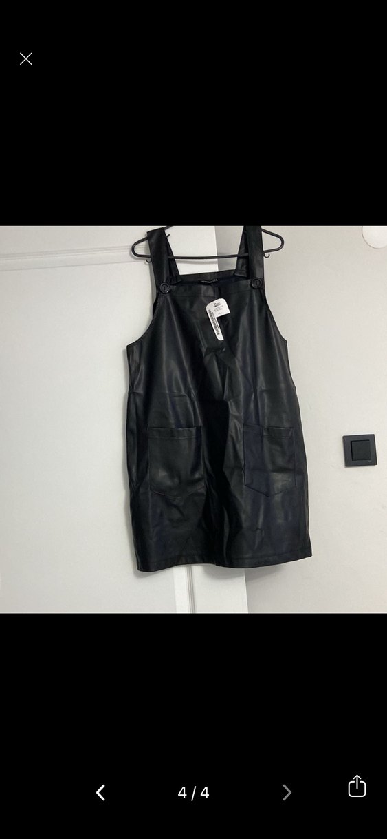 Siyah deri midi uzunlukta, askılı ve kemerli, bol kesim kadın tulum. Günlük sokak stili için uygundur.