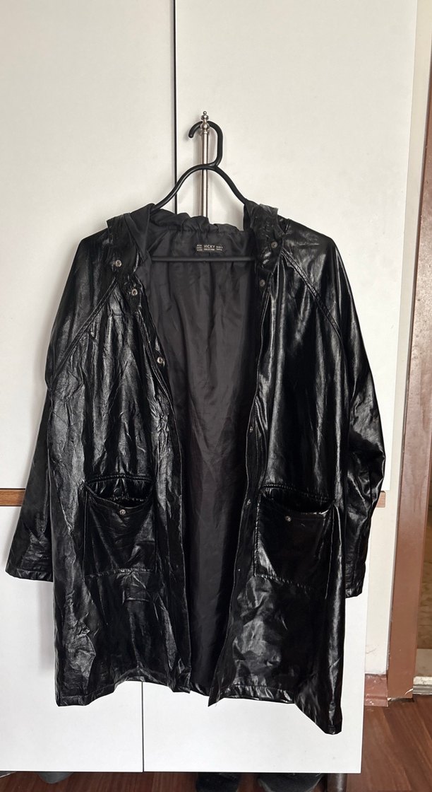 Siyah deri midi boy, düğmeli, bol kesim ceket. Notlu yaka ve askılı kollara sahip, düz desensiz yüzey. Günlük kullanıma uygun goth ve grunge punk tarzında.