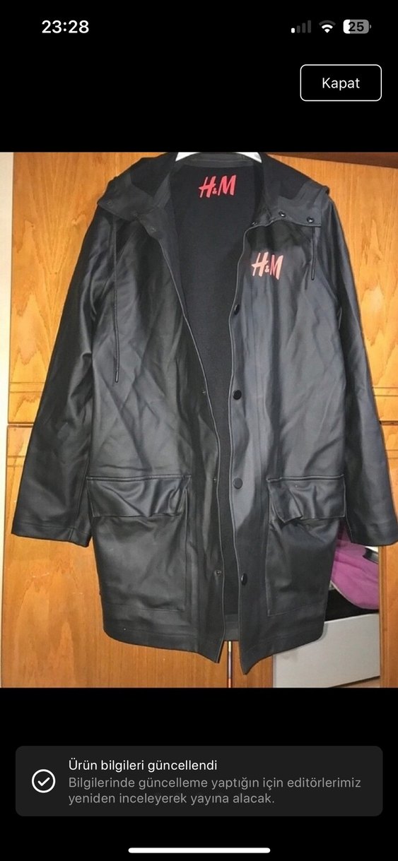 H&M marka siyah deri ceket, bol kesim, uzun kollu ve kesik yaka detaylıdır. Düğmeli ve midi boyda, günlük sokak stiline uygundur.