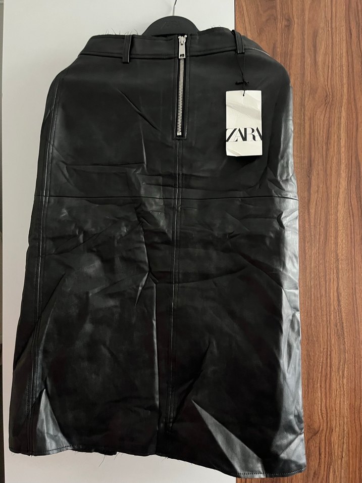 Fitted kesim siyah deri ceket, uzun kollu ve kesik yakalıdır. Fermuarlı ön kapama ve midi boyuyla minimalist sokak tarzını yansıtır. Zara etiketlidir.