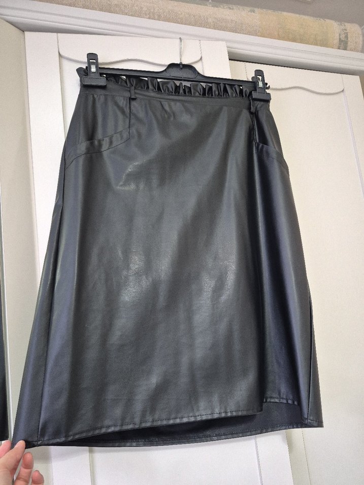 Siyah deri midi hamile eteği, kemerli ve bol kesimdir. Günlük kullanım için uygun gotik tarzda tasarlanmıştır.
