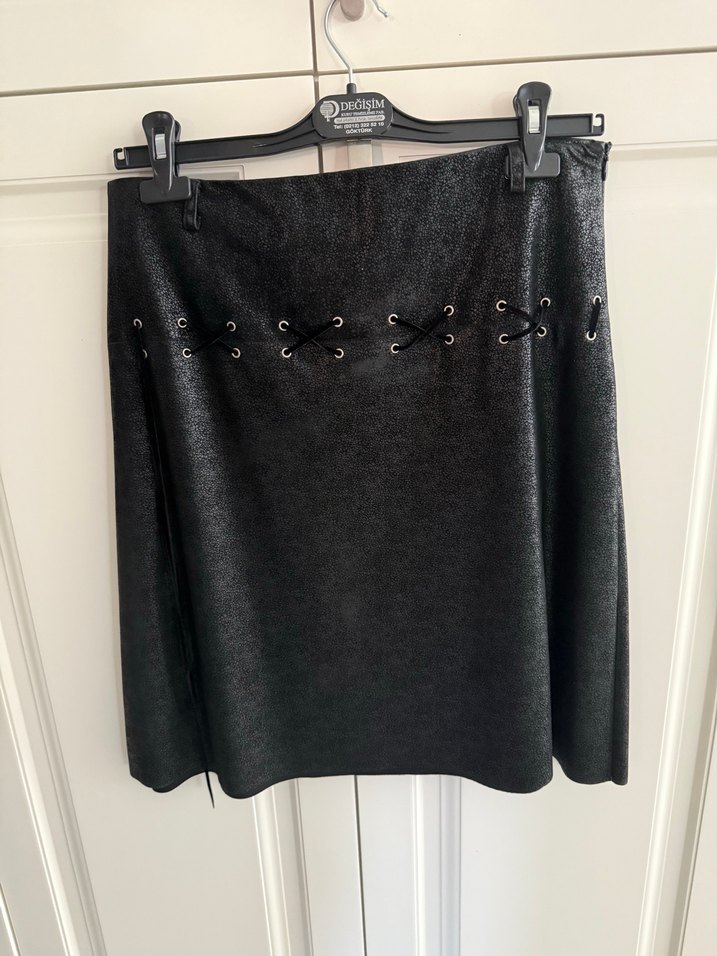 Bu siyah deri etek, bağcıklı ve kemerli tasarımıyla gotik ofis stiline uygun şık bir seçenektir. ✨