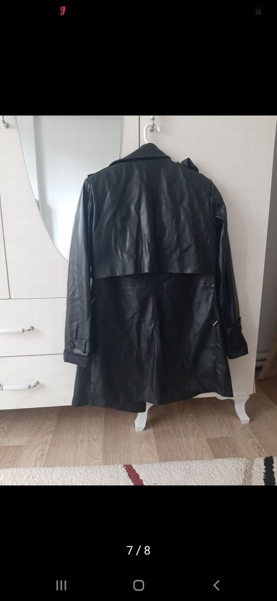 Siyah deri midi ceket, kesik yakalı ve kemerli. Uzun kollu, normal kesim ve günlük kullanım için uygun.