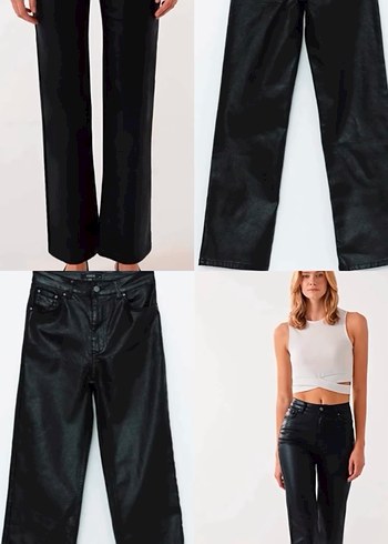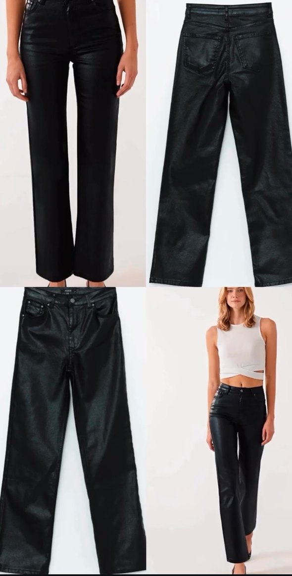 Siyah deri, normal boy midi uzunluğunda, rahat kesimli kadın pantolon. Minimalist ve zahmetsiz şıklık sunar.