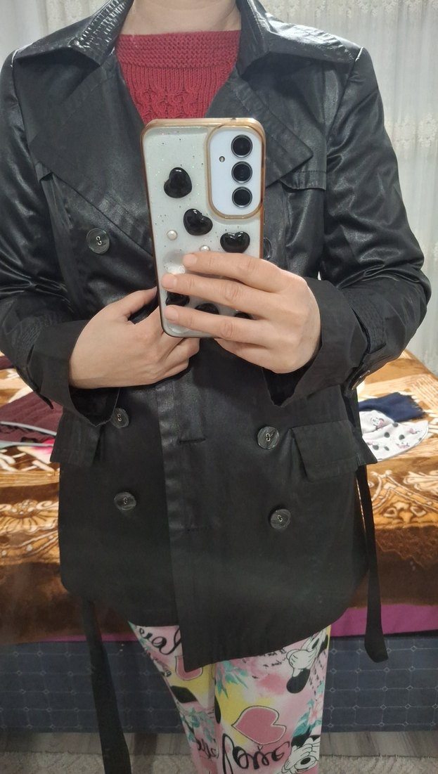 Siyah deri, düğmeli, kesik yaka ve uzun kollu midi trençkot. Günlük sokak stiline uygun, rahat kesim. izzet candan markasına ait trençkot sadece koltuk altının iiç kısmında deforme var oda zaten belli olmaz Blazer ceket gibide duruyor düğmeleri takınca uzunluğunda kalça kapatır