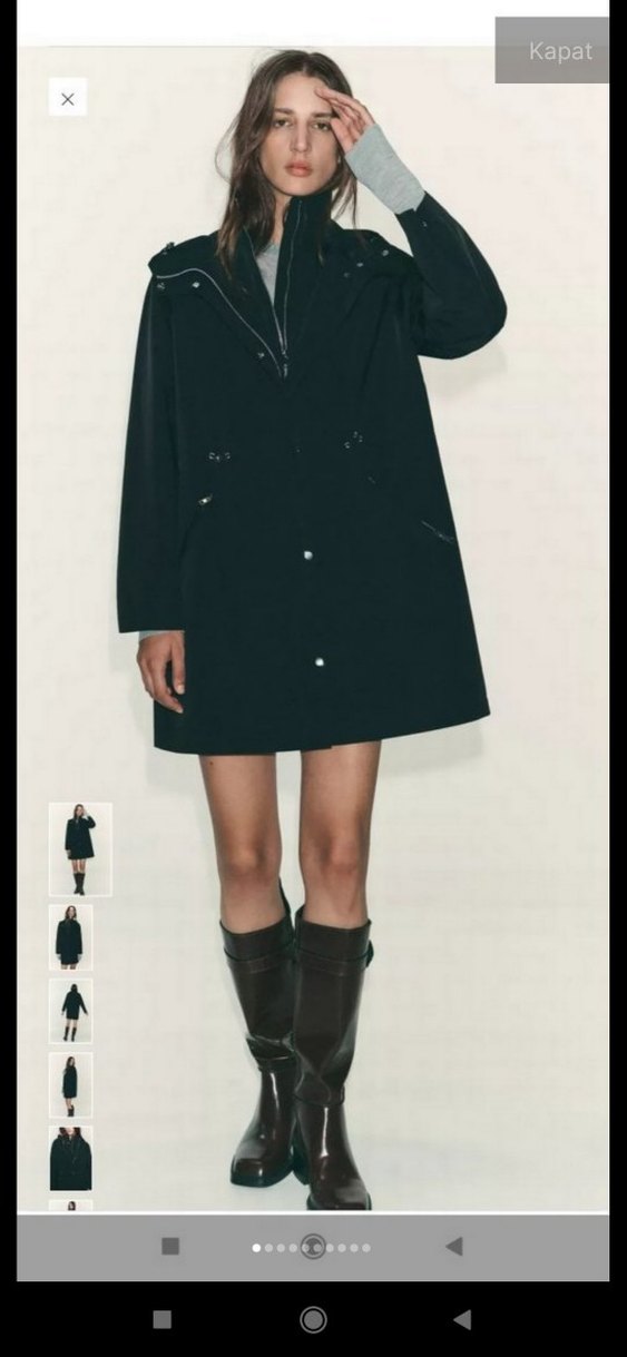 Siyah deri midi yağmurluk, bol kesim, çıtçıtlı ve kayışlı kollu, günlük kullanım için zahmetsiz şıklık sunar. ️
