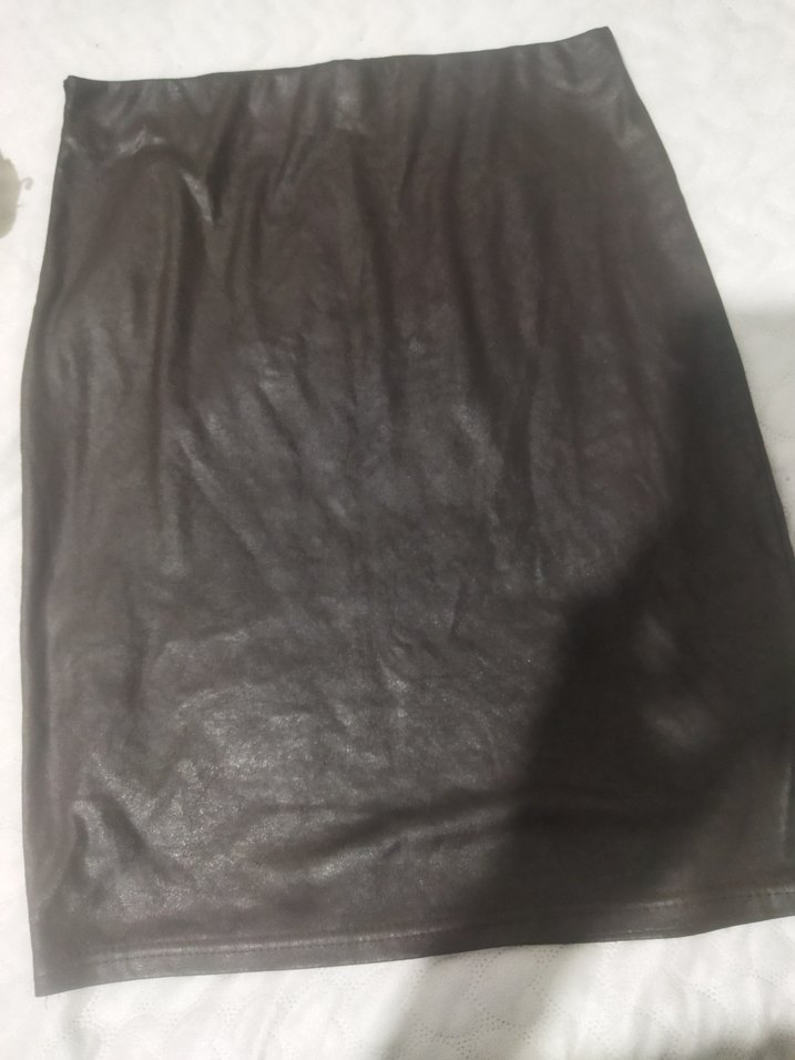 Siyah deri midi kalem etek, drapeli ve vücuda oturan kesimiyle minimalist gotik tarzı yansıtır.