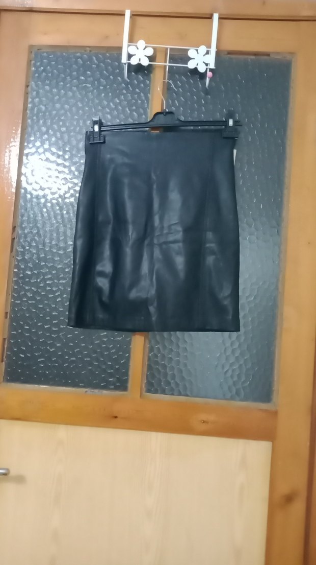 Bu siyah deri midi mini etek, kemerli bel ve desen içermeyen minimalist tasarımıyla ofis ve sokak stiline uygundur. 48 boy 45 en